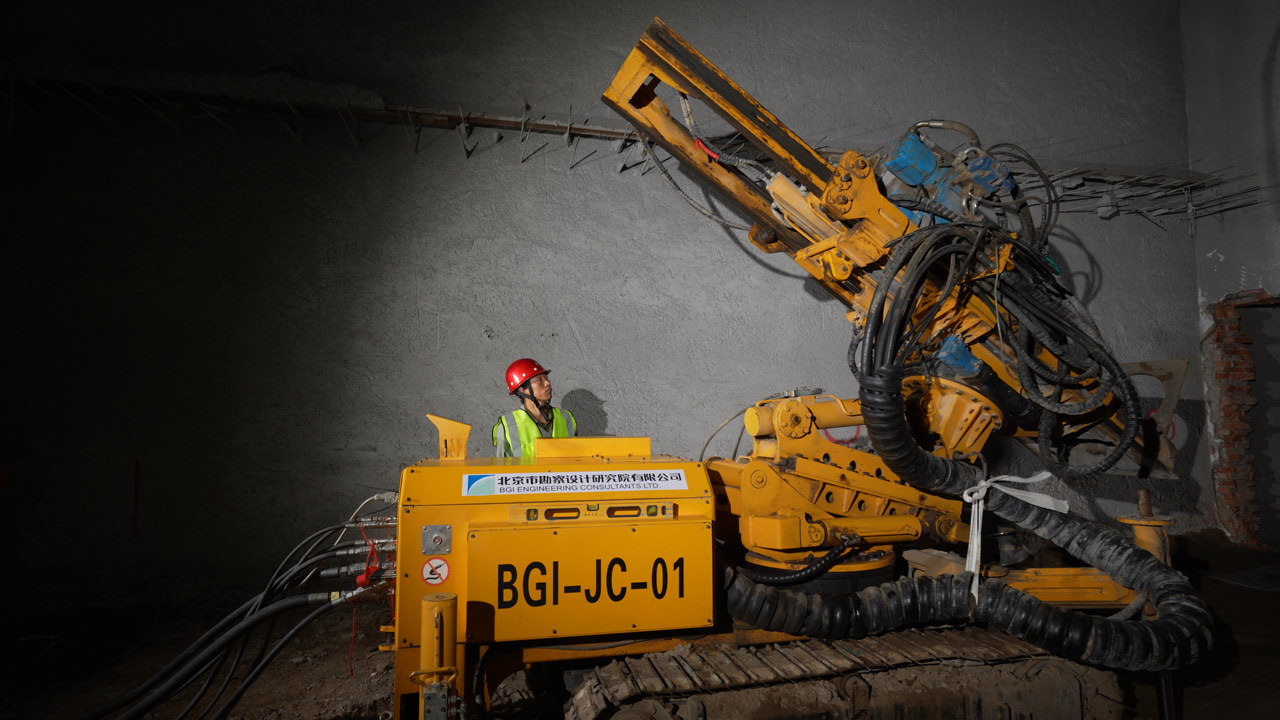 案例一:前門地下城是中軸線上保留完好且利用開發(fā)的早期人防工程,也是典型的城市更新地下結(jié)構(gòu)改造加固工程。本項目施工400mm護坡樁、大廳托換樁、以及300mm抗浮錨桿,其中托換樁樁長達19.5m。采用本分體式低凈空多功能履帶鉆機,成功實現(xiàn)了大廳托換加固工程和抗浮工程施工,助力“北京地下城”改造升級為人防博物館體驗中心。