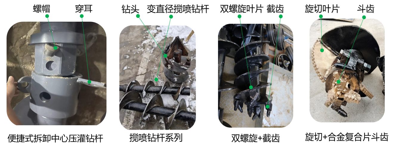 鉆頭改進設計:雙螺旋+截齒鉆頭有效解決砂層鉆進掉土難題,旋切+斗齒鉆頭在硬質(zhì)黏土、三合土、小卵石中顯示出強大的切削鉆進能力。