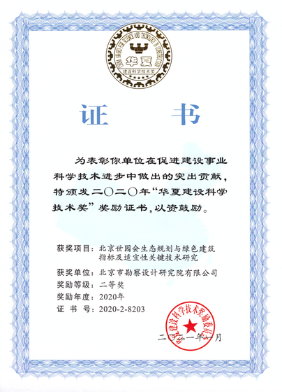 1月8日,我院與中國建筑科學研究院有限公司等單位共同完成的北京市科委課題“北京世園會生態(tài)規(guī)劃與綠色建筑指標及適宜性關鍵技術研究”項目榮獲2020年華夏建設科學技術獎二等獎。