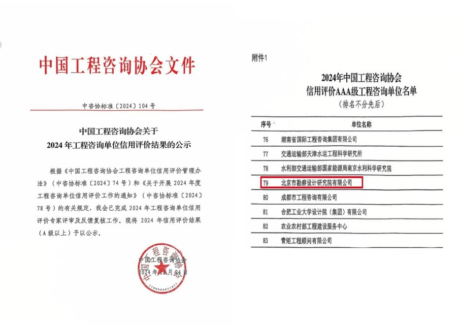 12月25日,在中國(guó)工程咨詢協(xié)會(huì)開(kāi)展的2024年工程咨詢單位信用評(píng)價(jià)工作中,我院獲得“2024年中國(guó)工程咨詢行業(yè)AAA級(jí)信用企業(yè)”榮譽(yù)稱號(hào)。
