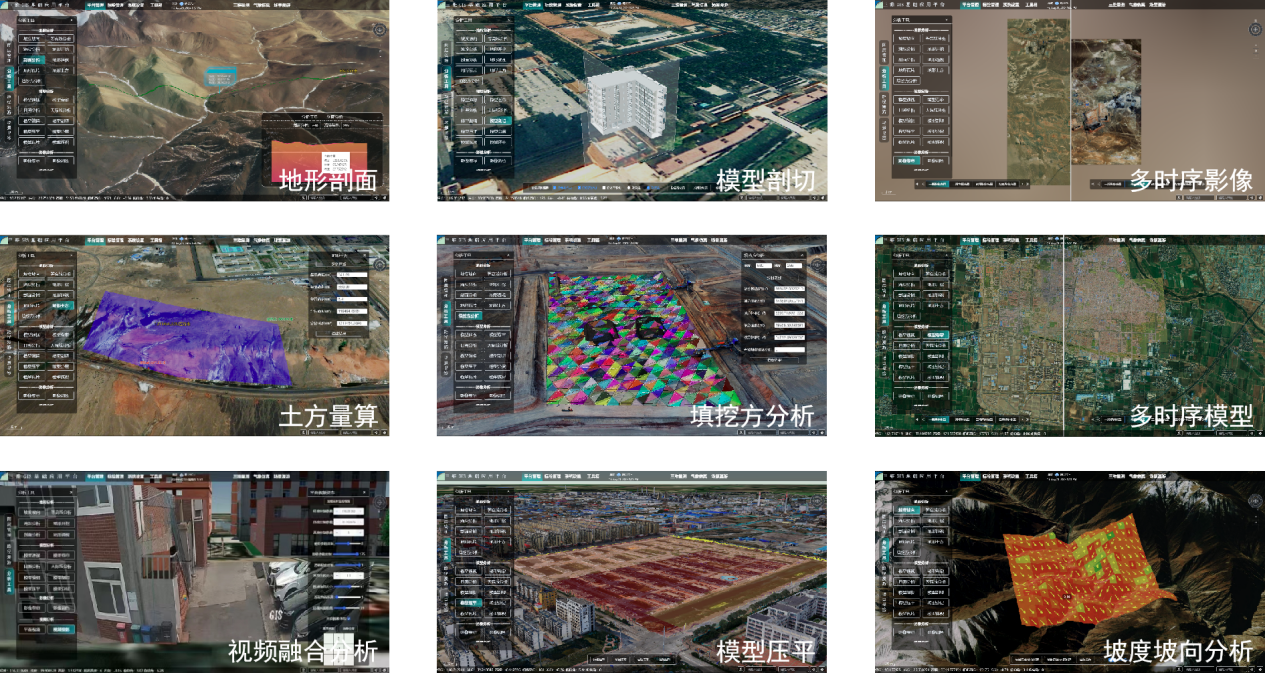 BGIS三維時空信息應(yīng)用平臺以影像、地形、模型、視頻等多源數(shù)據(jù)為基礎(chǔ),構(gòu)建出時空數(shù)字底座,該平臺目前已包含30余項空間分析功能模塊。通過GIS空間分析算法,實現(xiàn)地形剖面分析、模型剖切分析、土方量算、填挖方分析、多時序影像及模型、視頻融合等強大的GIS分析功能,為工程應(yīng)用提供強有力技術(shù)支撐。