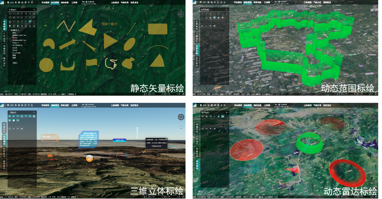平臺內(nèi)置靜態(tài)矢量、動態(tài)范圍、三維立體、動態(tài)雷達(dá)四類標(biāo)繪模塊,研發(fā)50余種二三維地理要素標(biāo)繪,實現(xiàn)標(biāo)繪要素空間與屬性信息入庫,滿足多方面的場景要素標(biāo)繪需求,助力構(gòu)建豐富的三維場景地理信息要素。