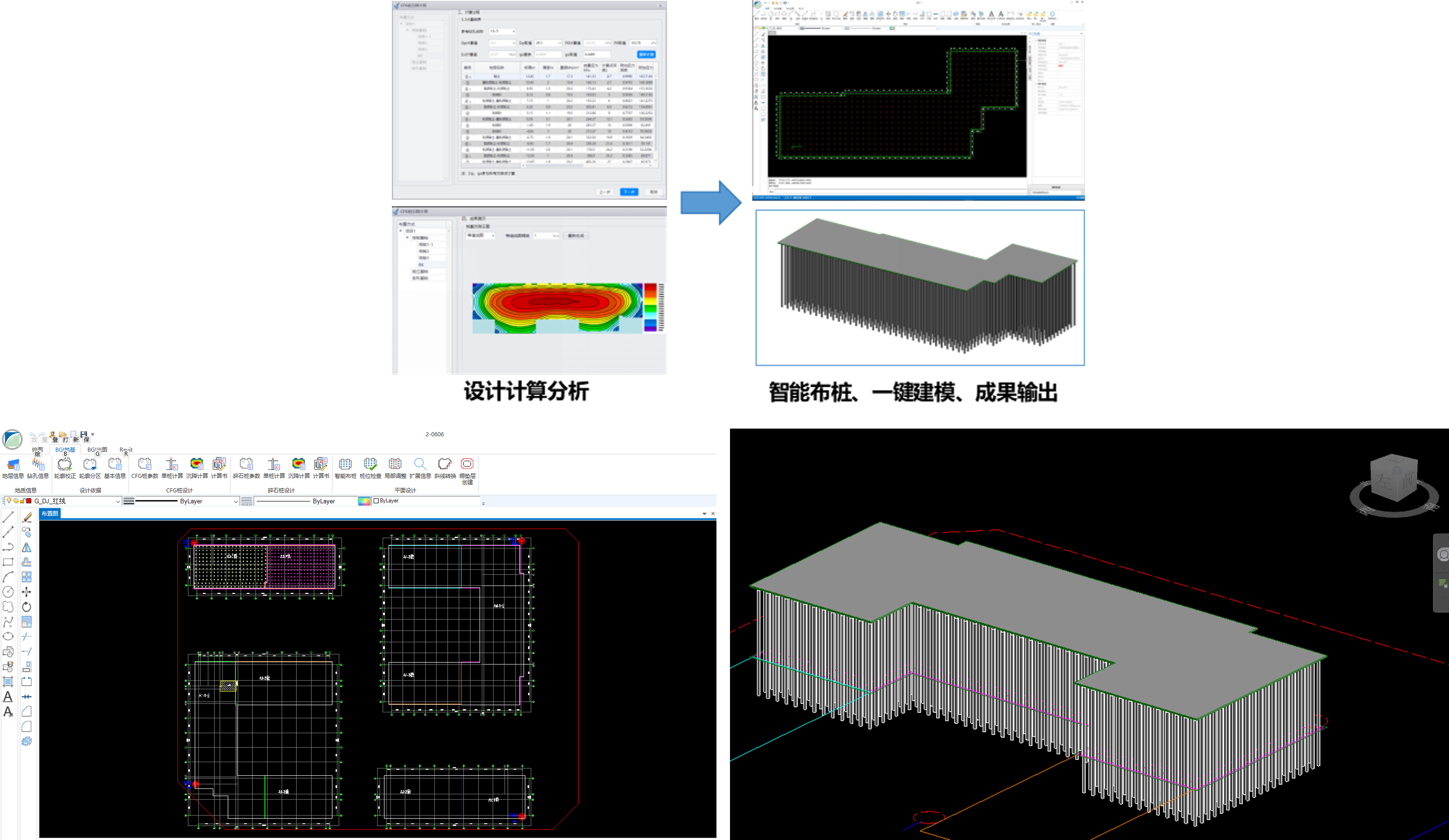 平臺集成計算書匯總自動輸出、布樁圖自動生成、樁位自動編號、一鍵智能標注、樁位智能調整、設計圖輔助設計、參數一鍵輸出、工程量成果自動統計等系統化的輔助輸出功能,對設計成果進行全方位、高效能的優(yōu)化與整合,顯著提高設計工作效率,確保設計成果的精準性和一致性,幫助工程師專注于設計的核心創(chuàng)意,為項目質量審核、過程管理、成果交付工作帶來極大便捷。