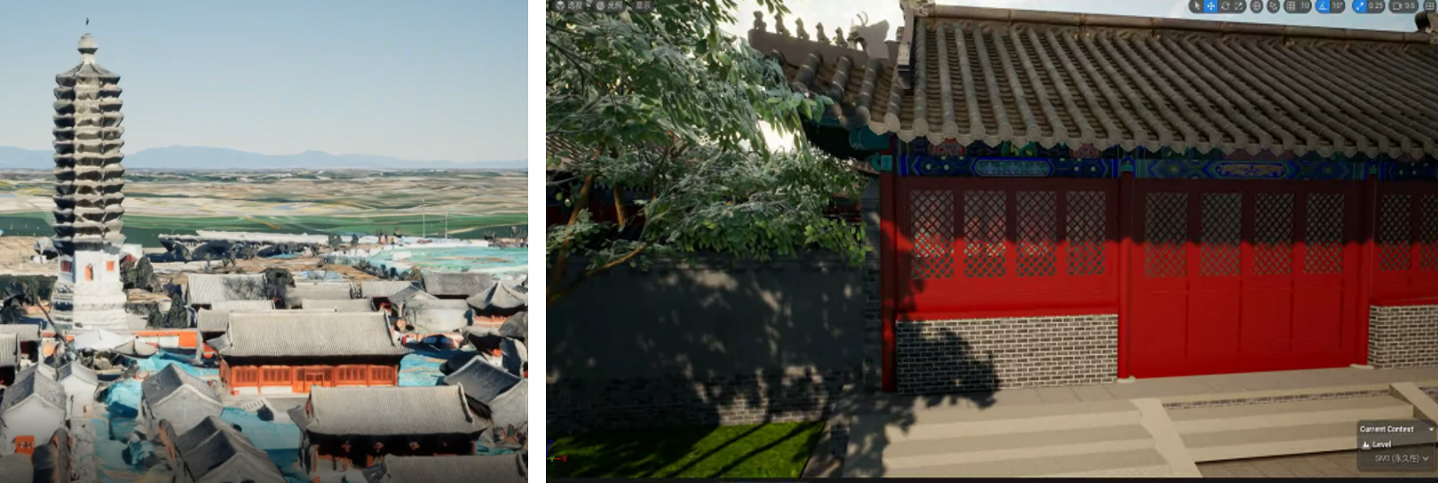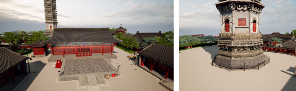 在場景渲染領域,充分利用虛幻引擎的高真實感與交互性優(yōu)勢,通過精細光照、PBR材質渲染及Lumen技術,實現古建筑模型的高保真呈現。色彩、光澤、質感均與實物無異,為游客營造出身臨其境的沉浸式體驗。