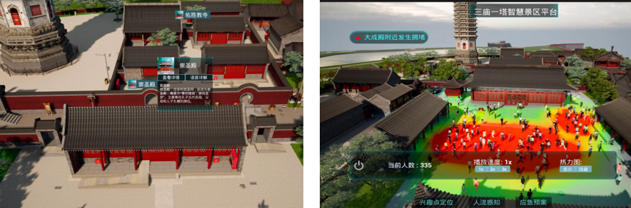 研發(fā)的三維可視化平臺集三維瀏覽、興趣點定位、模擬仿真于一體,游客可自由探索虛擬場景,深入了解古建筑背后的歷史故事。同時,平臺賦能景區(qū)管理,實現二維預案的數字化升級,助力實時規(guī)劃路線與精準決策。