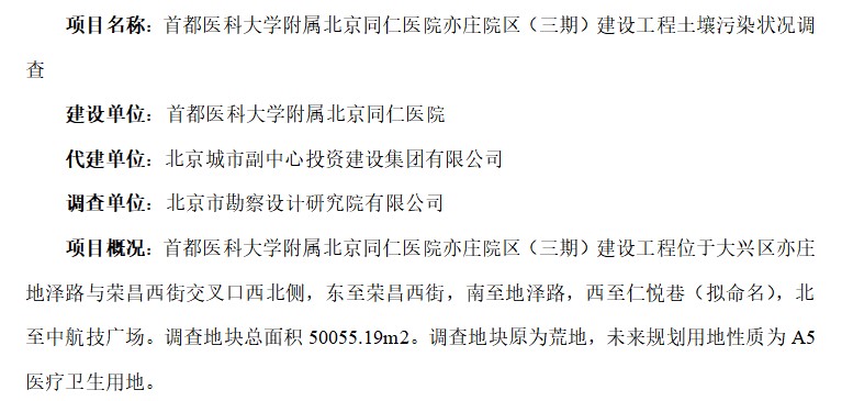 首都醫(yī)科大學(xué)附屬北京同仁醫(yī)院亦莊院區(qū)(三期)建設(shè)工程土壤污染狀況調(diào)查